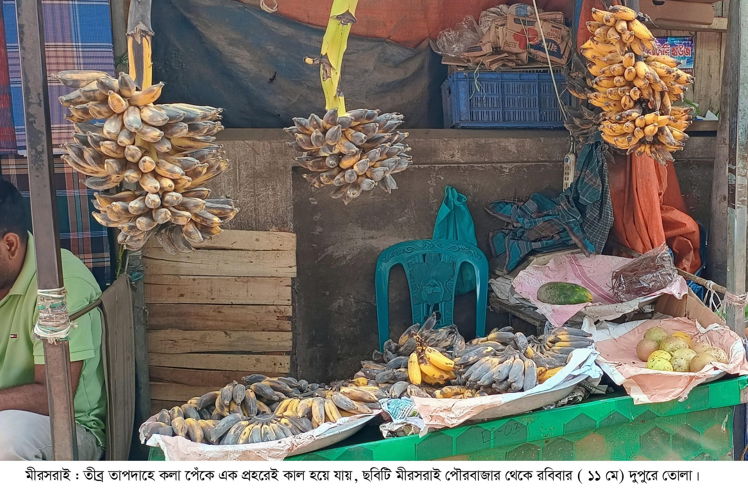 তীব্র এই তাপদাহকালে মীরসরাই সদর বাজারের কলেজ রোডে সুমন ( ৩২) নামে এক কলা ও পেপে দোকানীর কলাগুলো সব দুপুর ১টা নাগাদ পুড়ে যাওয়া বর্ণের কালো হয়ে যায়। কয়েক কলার আস্ত ছড়া এভাবে কাল কেন হলো জানতে চাইলে সুমন জানায় সকালে ও কলাগুলো বিক্রি হবার উপযোগী হলুদ বর্ণের ছিল। বেলা যতোটা বাড়তে থাকে দুপুর নাগাদ রোদের তাপে প্রায় কলা এভাবে কাল হয়ে যাওয়ায় আর কেউ কিনছে ও না। অগত্য সব ফেলে দেয়া ছাড়া উপায় নেই। পাশ^বর্তি দোকানীরা ও বলে রোদেই এমন হয়ে গেছে। এই বিষয়ে উপজেলা কৃষি কর্মকর্তা কর্মকর্তা কাজী নুরুল আলম বলেন প্রচন্ড তাপদাহে আম, জাম, কাঠাল সহ সবই পেঁকে যাচ্ছে দ্রুত । কলাগুলো সম্ভবত পরিপক্কতা কম বা ক্ষিনকায় থাকায় গরমে এভাবে পুড়ে গেছে। আবহাওয়ার বৈরিতায় এমন হতেই পারে। এভাবে চলতে থাকলে অনেকের সবজি ক্ষেত ও পুড়ে যাবার সম্ভাবনা রয়েছে বলে তিনি জানান।